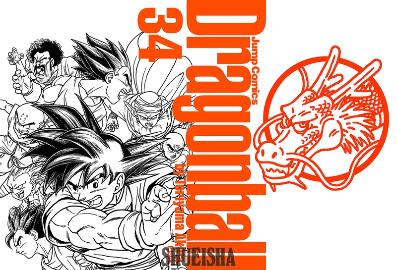 Here is the line art for the front cover of volume 34, the final volume of the Dragon Ball Complete Edition. It has an impressive, dynamic feel that leaps off the page even before being colored in. Rather than being simply filled in with a solid black, the flow and shading of the hair is carefully rendered, showing an impressive attention to detail.
