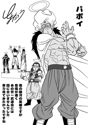 The illusive Papoi never did make a physical appearance in the manga, but for fans eager to get a look at this fabled warrior, the Dragon Ball Z anime and the feature film "Dragon Ball Z: Fusion Reborn" are the places to look!