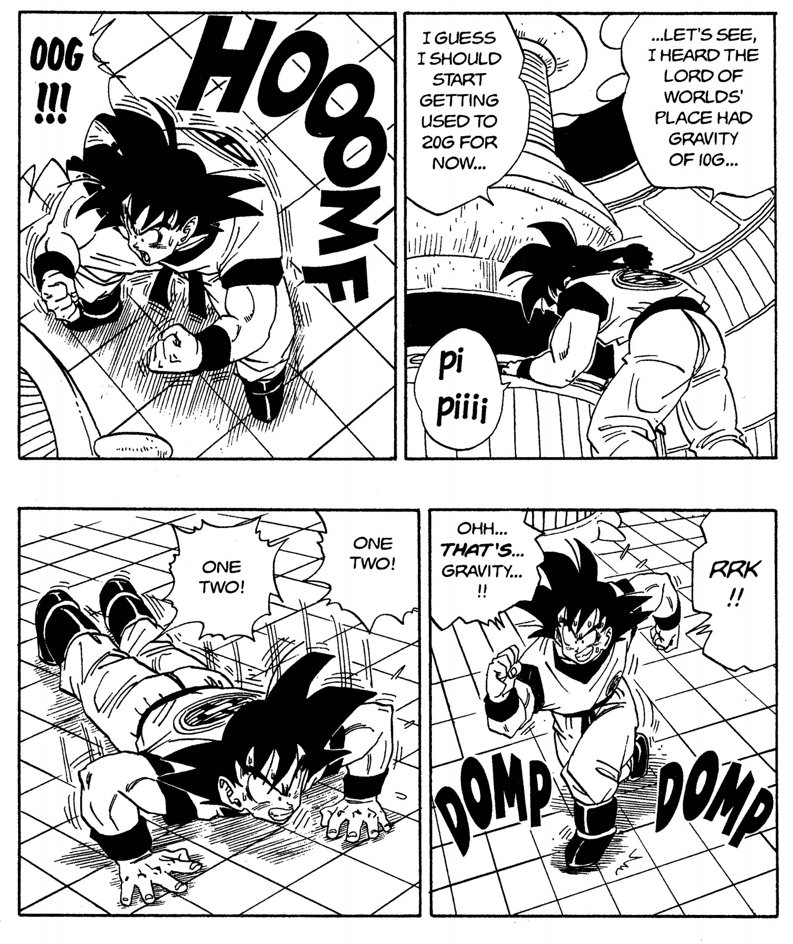 Goku diligently conducting his gravity training on the spaceship headed for Planet Namek