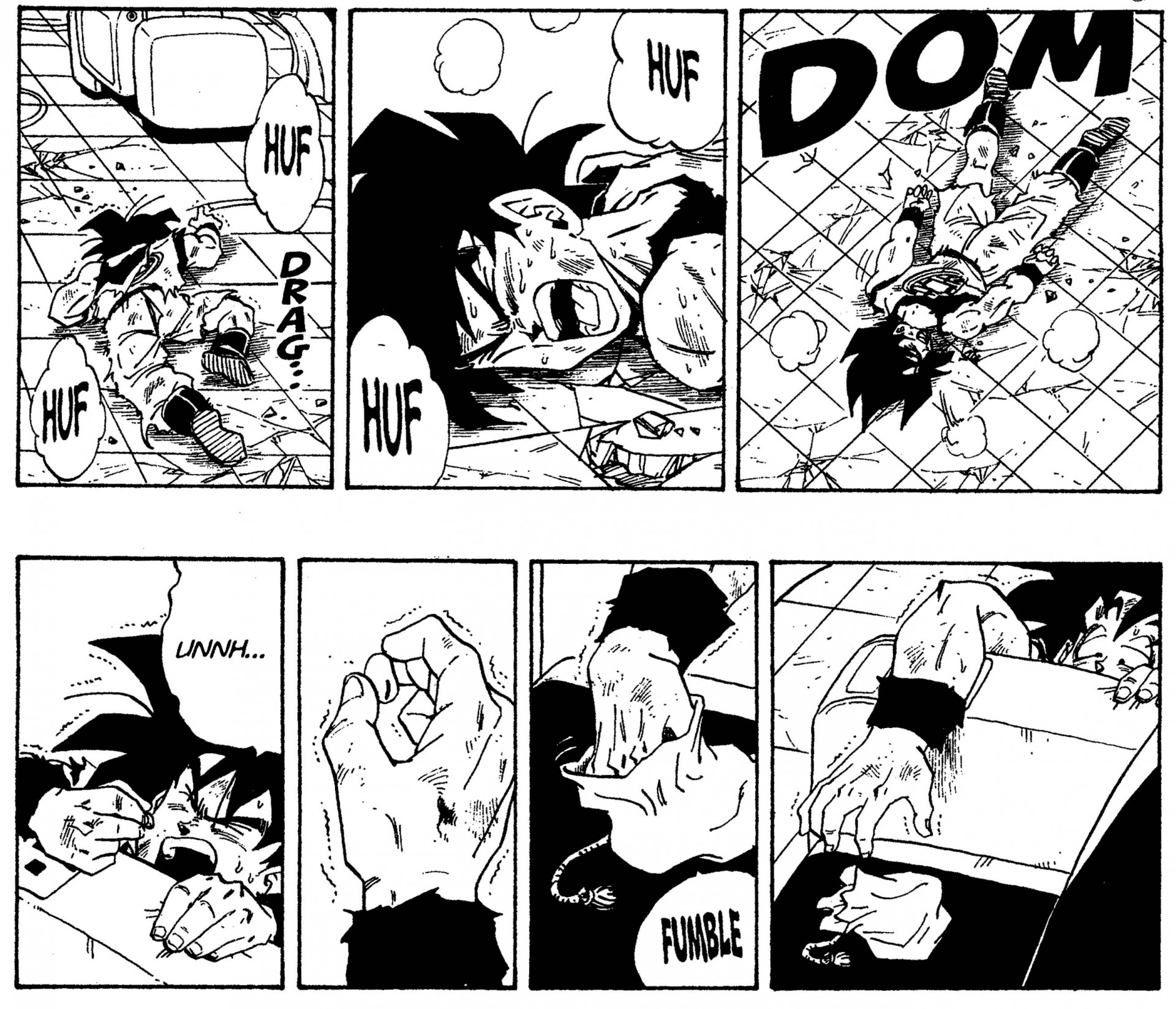 Goku crawling on his belly, reaching for a Senzu bean