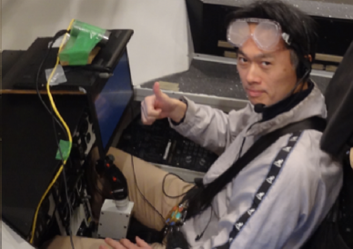 Prof. Hirata strapped into the equipment as a participant in the experiment. (Picture provided by Prof. Hirata)