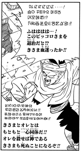 At the 23rd Tenkaichi Budokai, Piccolo is able to read Shen's mind and discover that Kami had taken over his body. It was then that Piccolo and Kami exchanged words in a mysterious language that no Earthling could comprehend—a language that was later revealed to in fact be Namekian!