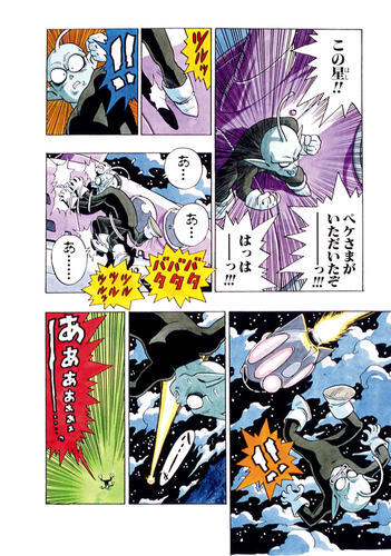 Running for just two chapters and with the tagline "Rejoice! Miracle Toriyama World Complete Stories Have Returned", this was Toriyama's first manga after Dragon Ball ended a year and a half prior, regarding which Toriyama himself commented, "I felt a little rusty." It's essentially a short gag manga, not unlike the author's earlier works, and focuses on a peculiar alien named Peke, his quest to subjugate the Earth, and the strange encounters he has with the earthlings he meets.