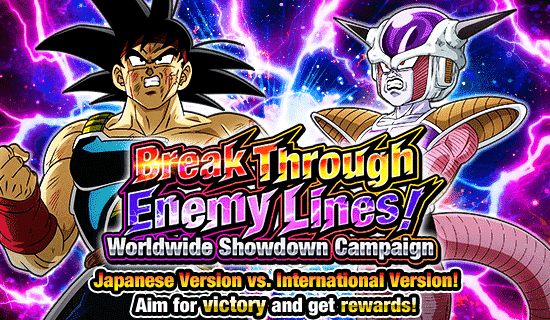 The "Break Through Enemy Lines! Worldwide Showdown Campaign" is on! It's the Dokkan Battle Japanese version VS the global version in a competition to see who can get the most KO's during the campaign period!! Depending on which version scores the highest, all players will get either Bardock or Frieza (First Form)!! There are also other great prizes like Dragon Stones up for grabs by completing personal missions! Do your part to lead your version to victory by KO'ing tons of enemies in quests and events, and get a little something for yourself while you're at it by completing missions!