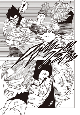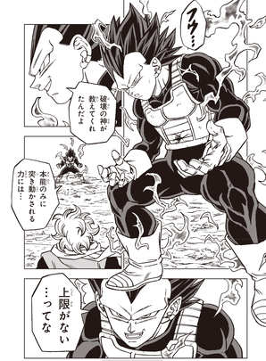 Enthralled by the purity of their battle, Vegeta's warrior-race blood surges within him...and the power of destruction he attained through his training with Beerus finally awakens!