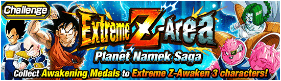 "Extreme Z-Area Planet Namek Saga" is on! This is an event you can only attempt with certain characters in your party, but if you claim victory in the extreme battles that await, you'll score Awakening Medals as rewards! Extreme Z-Awaken the applicable "Planet Namek Saga" category characters to power up their leader skills, passive skills, and super attacks!