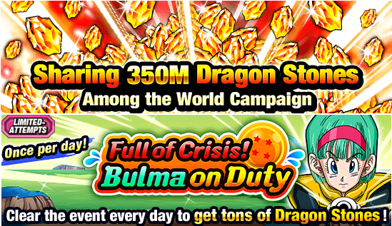 The "Sharing 350M Dragon Stones Among the World Campaign" is also ongoing, so keep on clearing "Full of Crisis! Bulma on Duty" and get your 10 Dragon Stones every day!