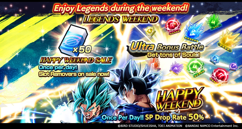 Plus, with the "HAPPY WEEKEND" summon giving you a 50% chance of scoring a SPARKING character once a day, this isn't an event you can afford to miss! Play this LEGENDS WEEKEND-exclusive summon and you'll even be in with a chance of bagging yourself one of the LEGENDS LIMITED characters in the lineup!