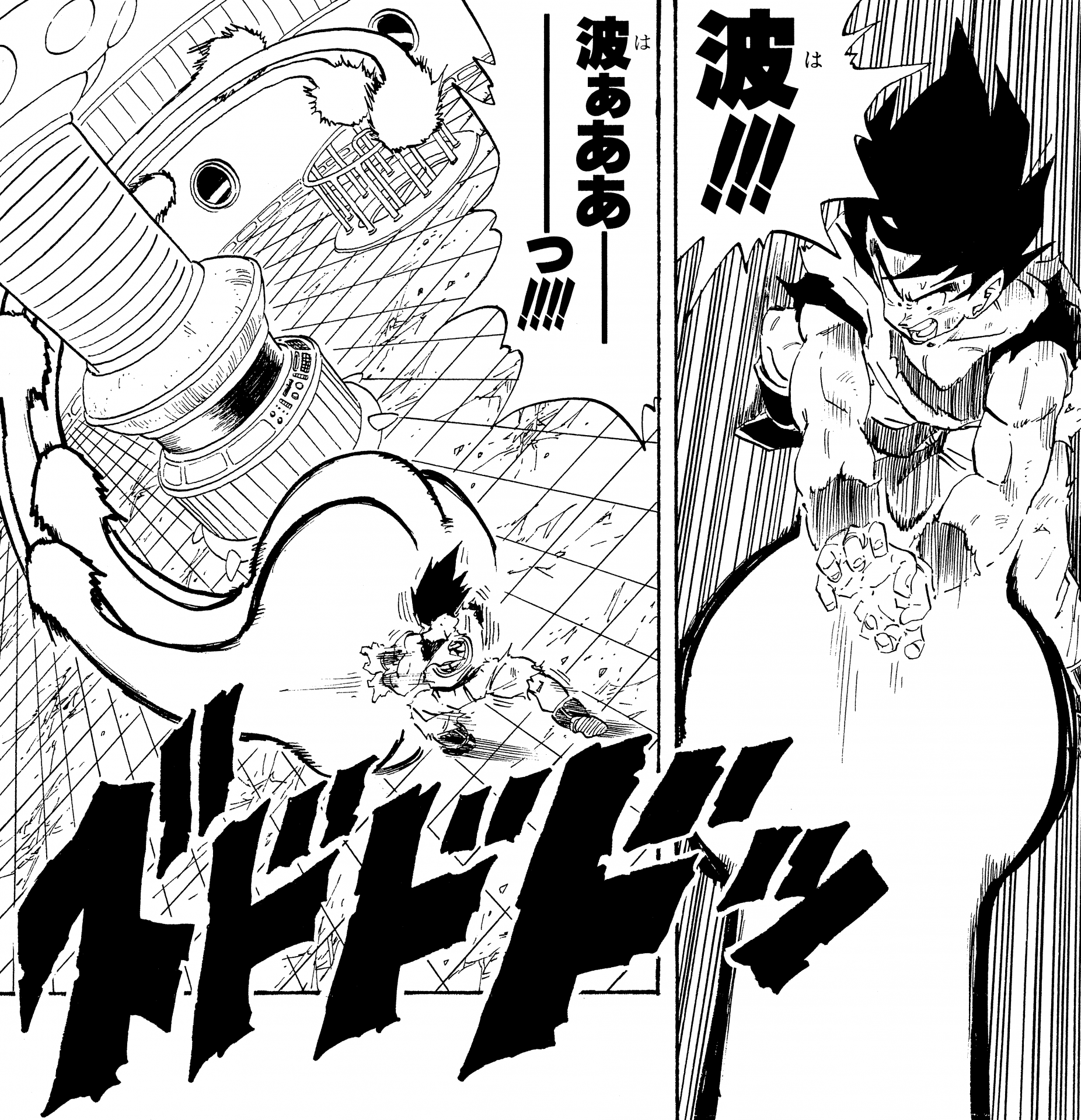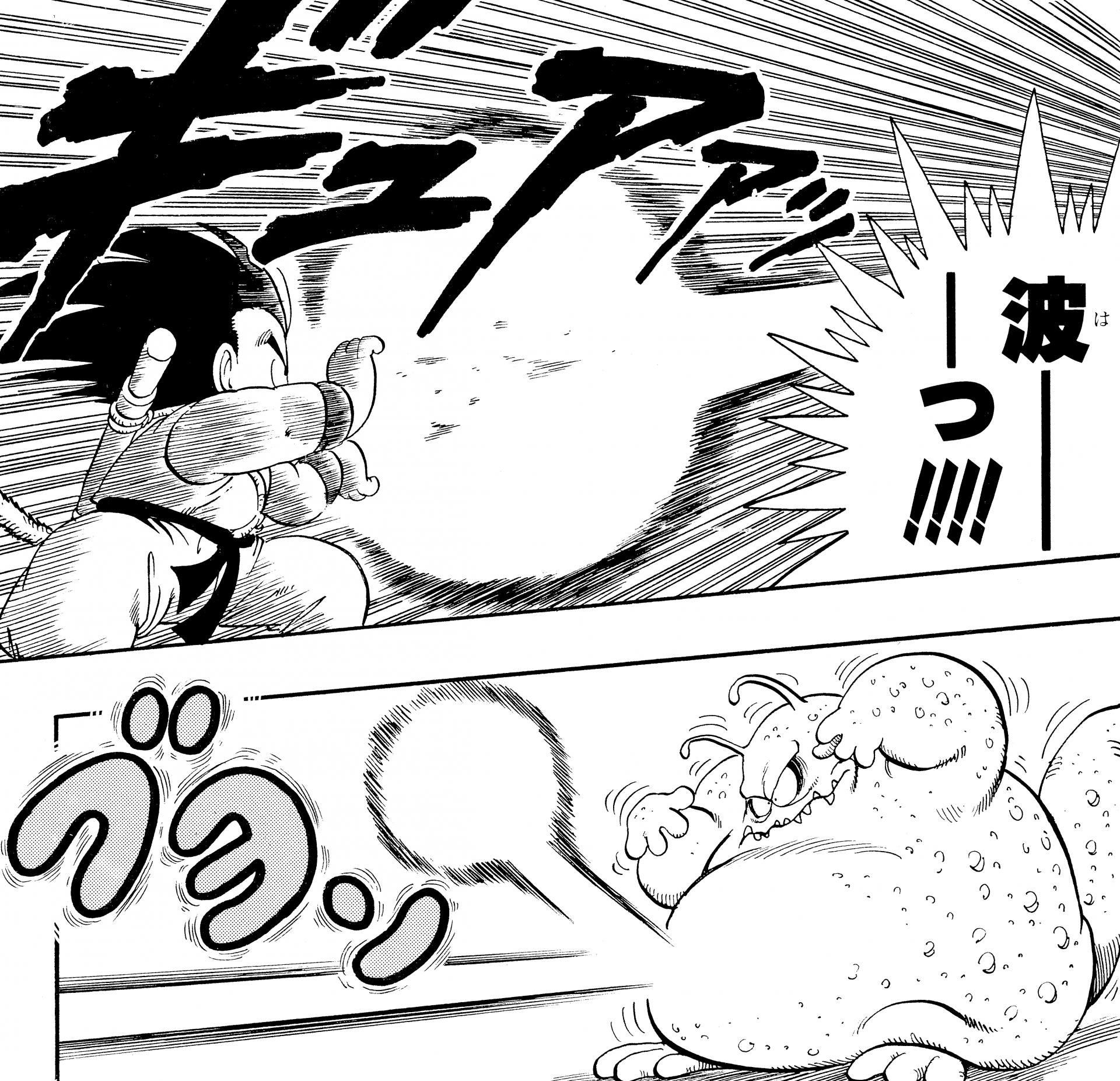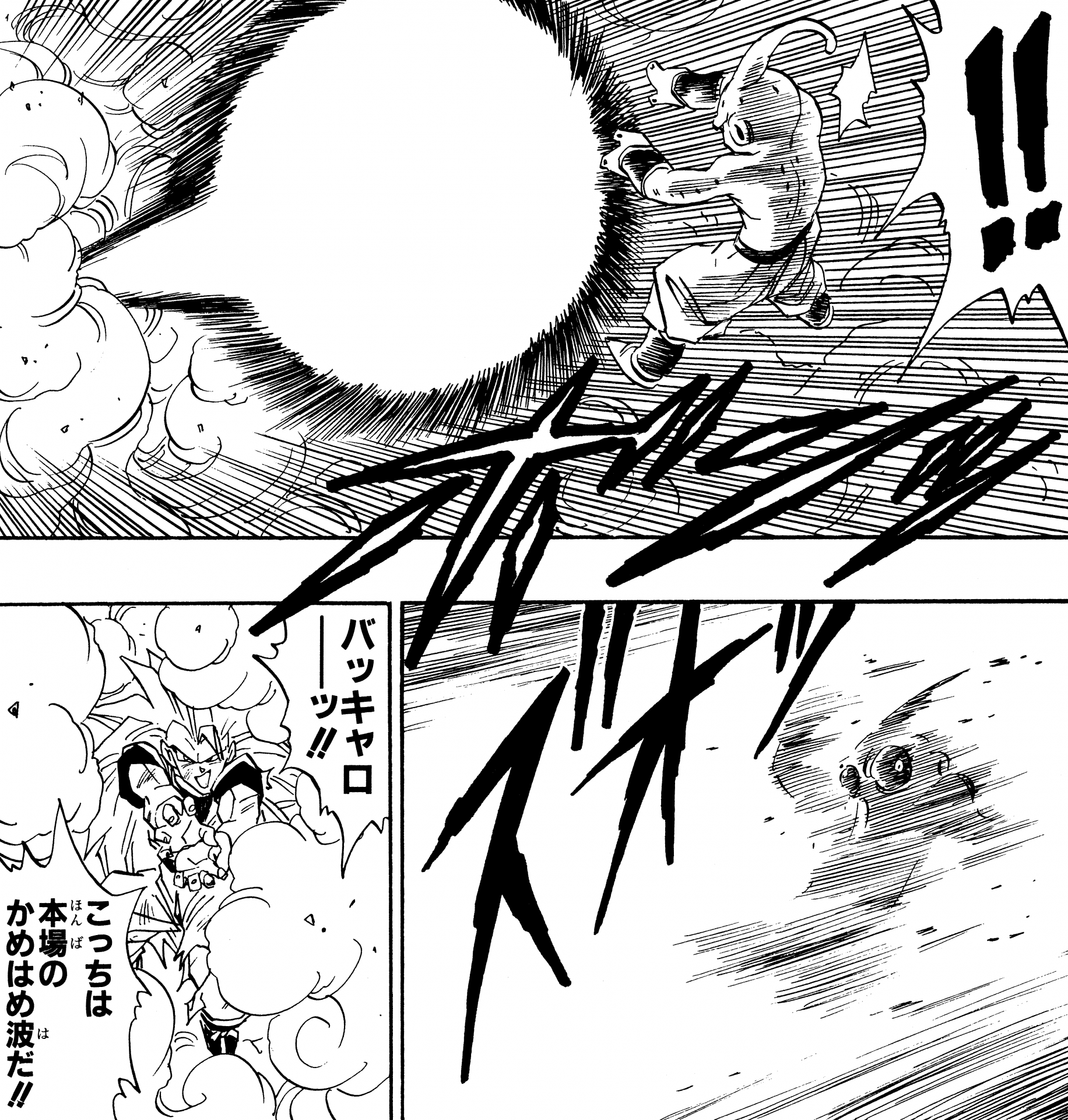 ・Tale 475, Page 5: Buu fires at Goku. Note that here, Buu became able to fire a Kamehameha after watching Goku perform the technique and copying his movements.