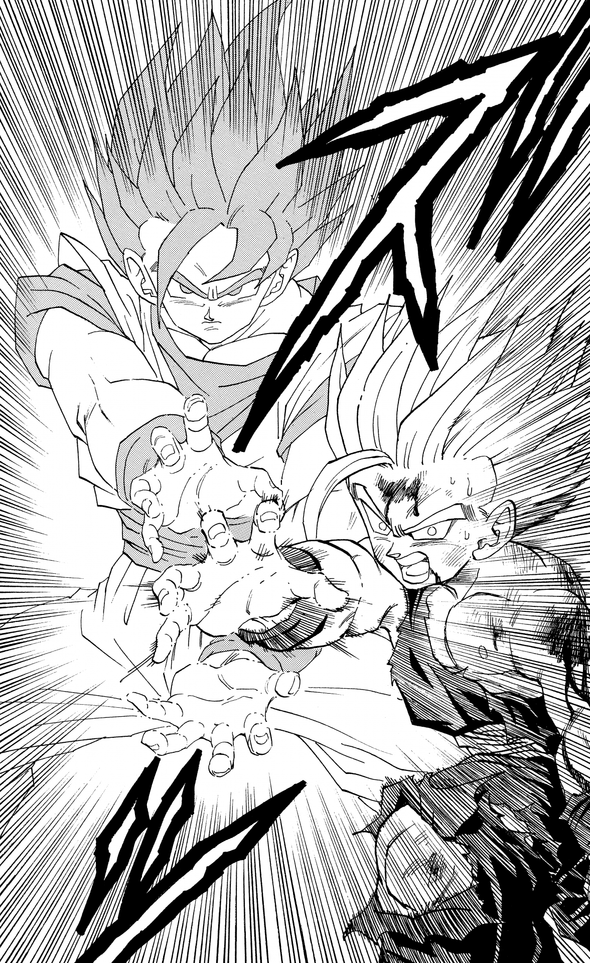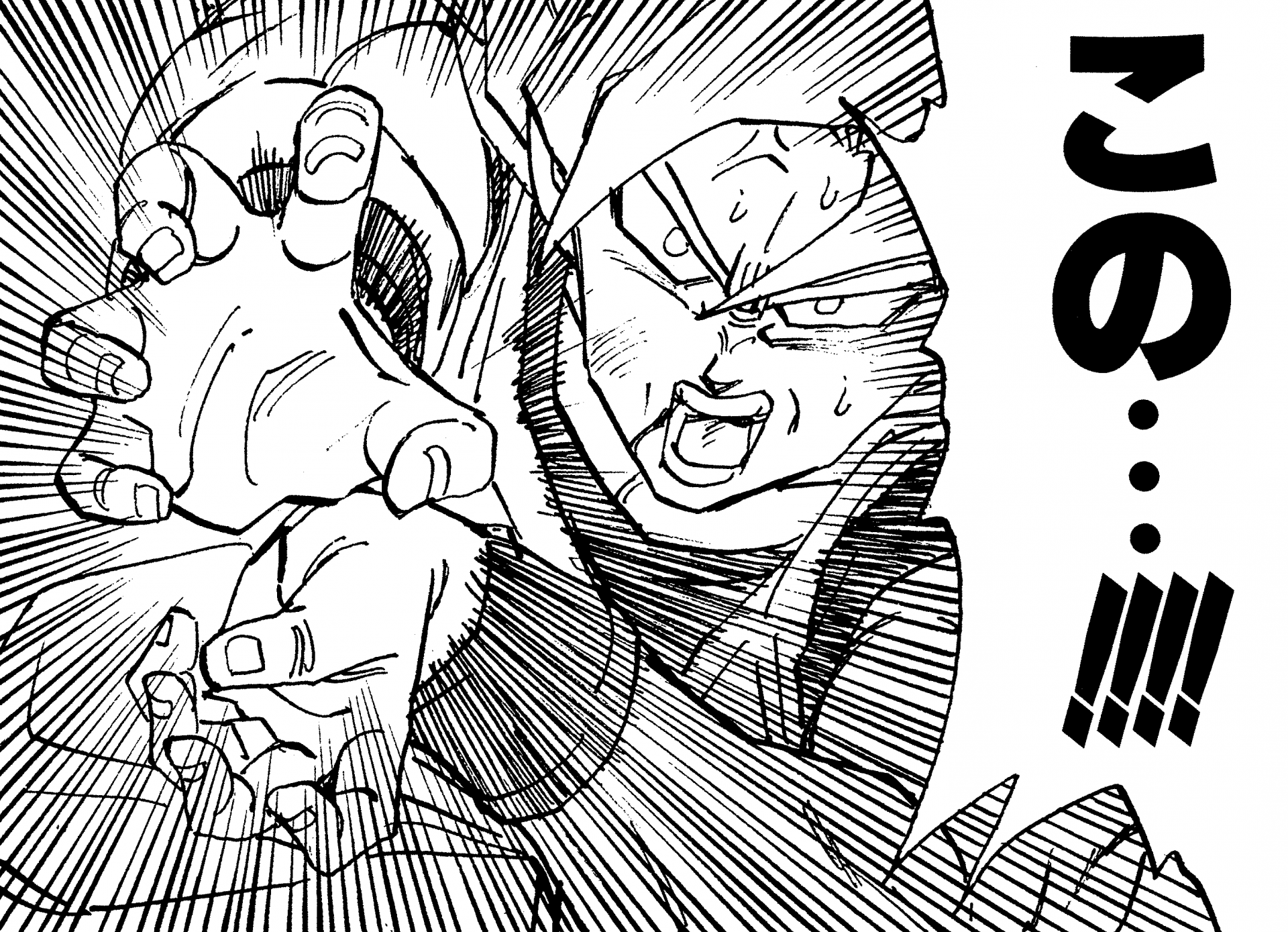 ・Tale 410, Page 12: Gohan fires a Kamehameha of his own in response to Cell's Kamehameha in the Cell Games.