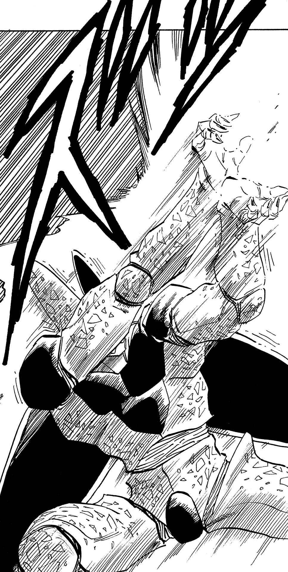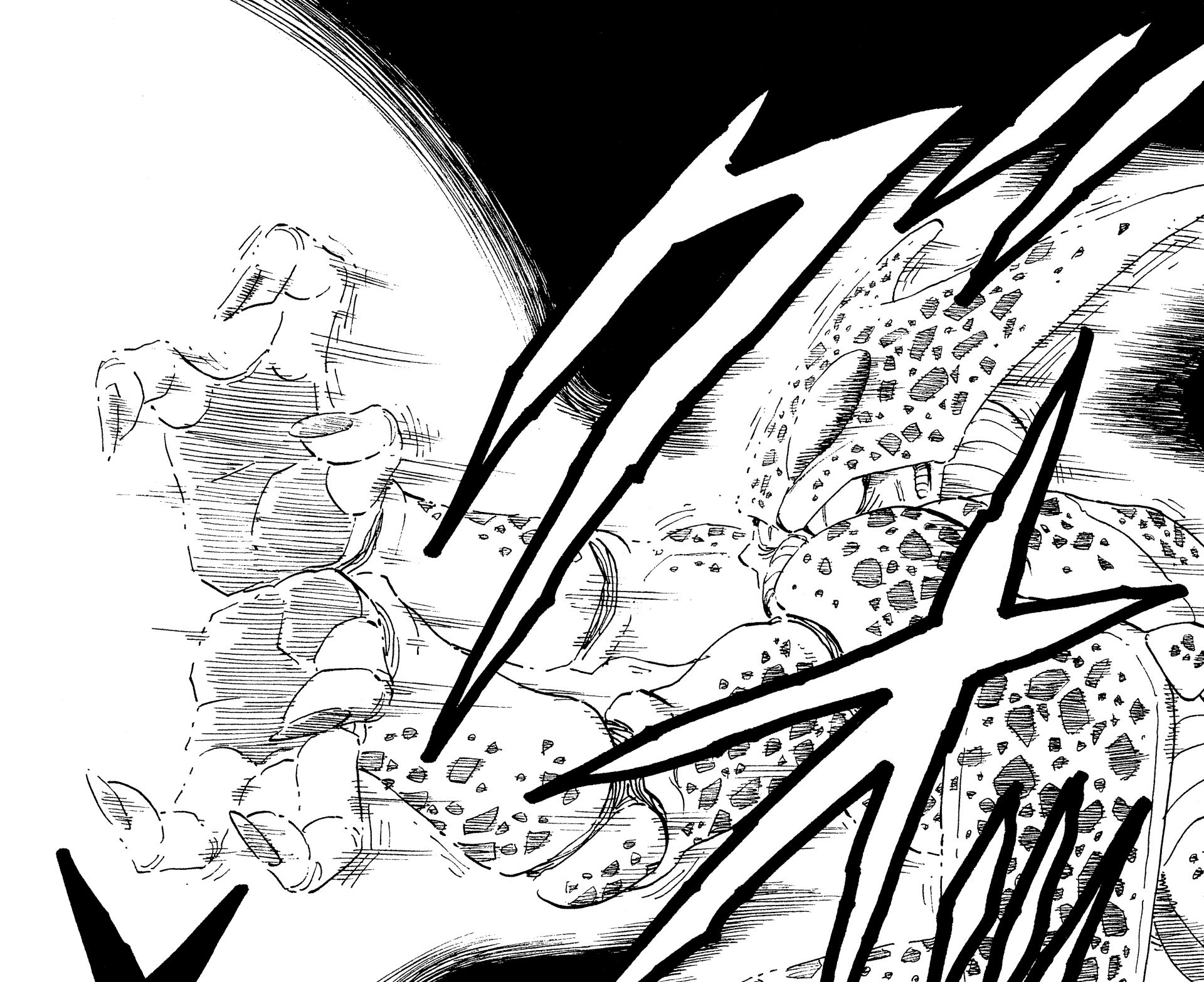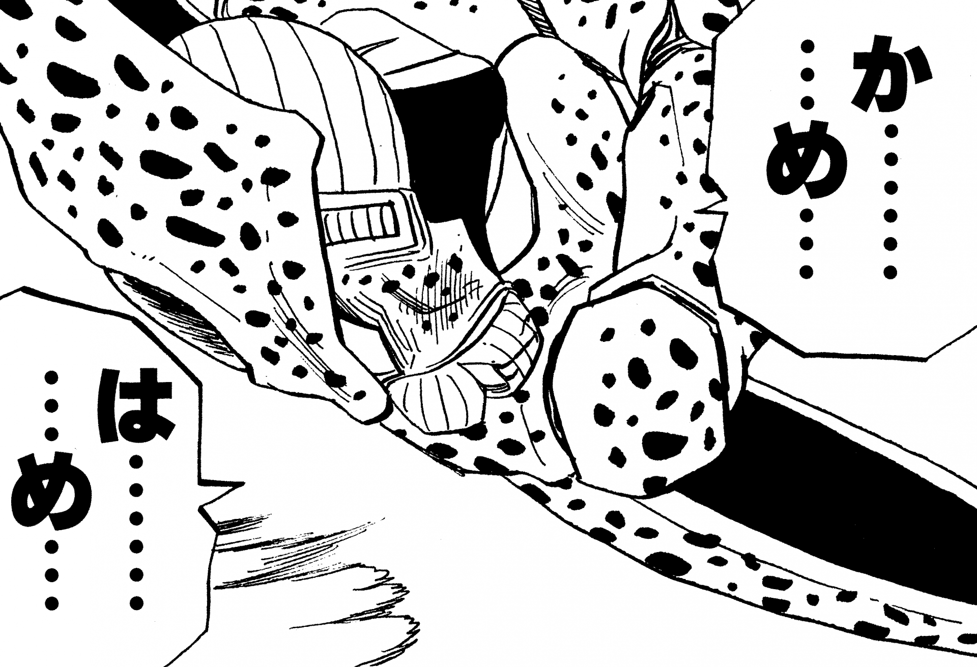 ・Tale 363, Page 2: Cell fires at Piccolo. Piccolo manages to have Cell to reveal that he's able to fire Kamehamehas because he was created using the cell data of Goku and the other warriors.
