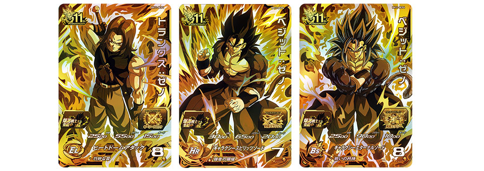 There are also two blasts from the past for the 11th anniversary set: Trunks: Teen and Vegeta from the first set of Dragon Ball Heroes, who are joining the lineup as memorial UR cards!