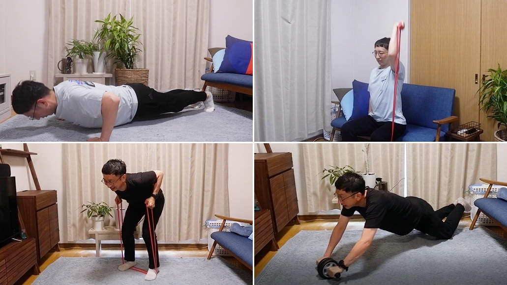 By using training equipment, your workouts become more efficient. We'll be using two bits of equipment that are both readily available to order online, relatively cheap, and easy to store at home: a resistance band and an ab wheel.