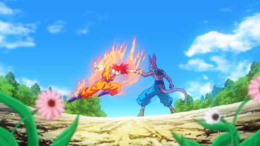 In his quest to find the Super Saiyan God, Beerus and his companion, Whis, pay a visit to the Planet of the Kaio, where he finds Goku. Beerus accepts the Saiyan's request for a fight and swiftly disposes of him in just two hits, demonstrating the phenomenal power he wields.