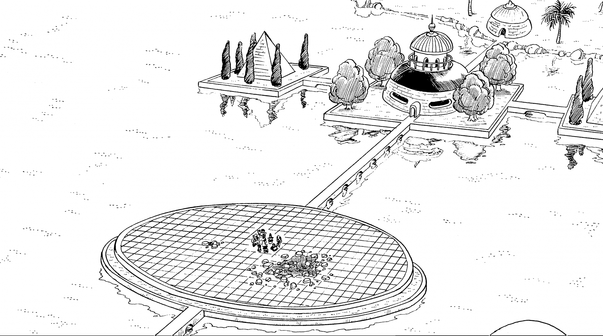 Uranai Baba's Palace was built on a lake in the desert. Goku came here after utterly destroying the Red Ribbon Army in search of a Dragon Ball that didn't appear on his Dragon Radar. Along with the central martial arts arena outside is the Devil's Cesspool, an indoor fighting area with a poison-filled swamp. Uranai Baba recruits skilled martial artists from the Another World to battle her customers and offers free readings to any who can beat them. Goku and his friends decided to battle rather than paying the fee, and our hero was able to briefly re-unite with his late adoptive father, Grandpa Gohan.