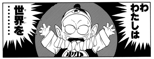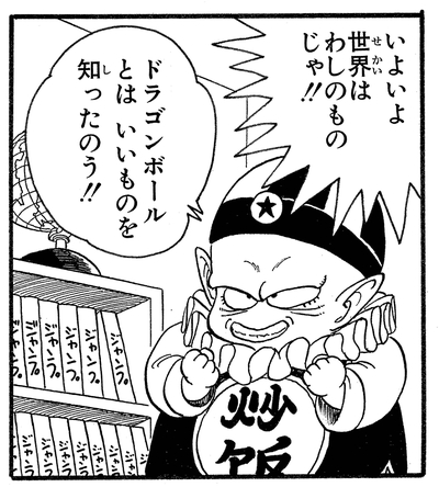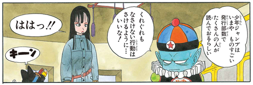 Pilaf scolds Mai for a crass gag she makes while the gang are looking for the final Dragon Ball, breaking the fourth wall and saying that considering the many readers of Shonen Jump, they'd best avoid doing anything shameful or scandalous.