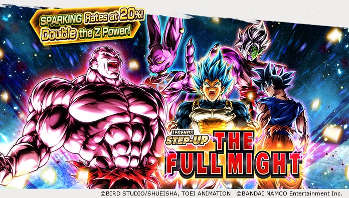 "LEGENDS STEP-UP - THE FULL MIGHT -" will be held in two parts: the first part will be a step-up summon with 2x Z Power drop amounts and a 20% drop rate for SPARKING rarity characters, and in the second part it will change and split into a Single Summon with a once-daily discount and a Consecutive Summon that guarantees one SPARKING character drop!