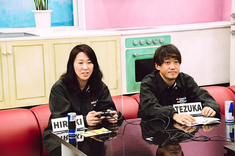 Hirano (left) and producer Hara (right), who have worked together on the same titles in the past. According to Hirano, "Producer Hara is dedicated to game creation, and he particularly enjoys big games—so much so that he even brought a console to the hotel to do some more gaming before coming to the venue."