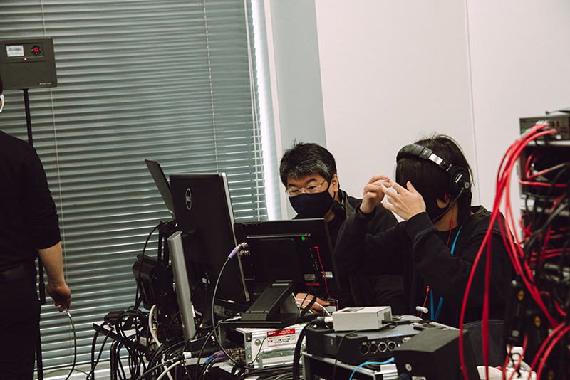 Shiba P (front / Dragon Ball Z Dokkan Battle producer) and producer Hashino (back / Dragon Ball Z: KAKAROT producer) standing by while keeping a watchful eye on TOSHI and OMATSU's performance.