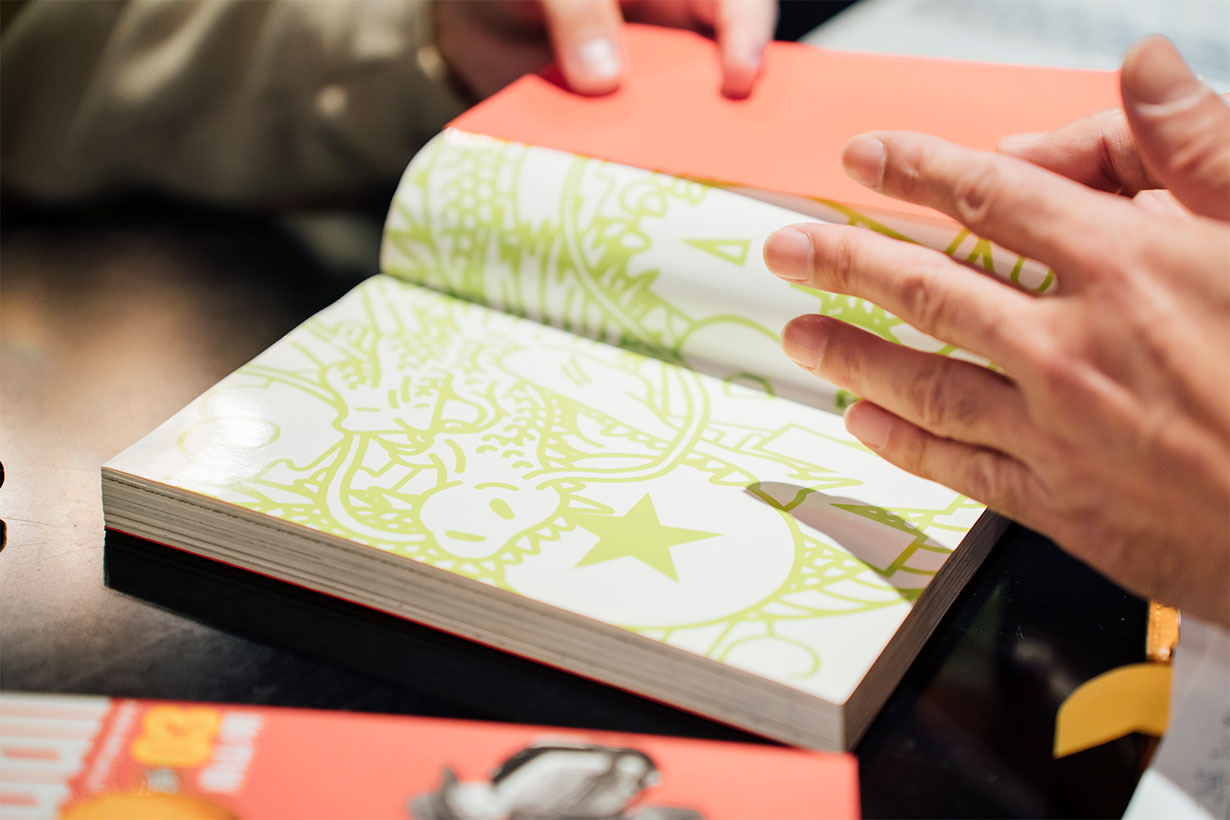 Shimada: So, 2002 was the year that the FIFA World Cup was held in Japan and Korea. I was watching the Korean team play on TV, and when the camera panned across the spectators in the audience, it was this vast sea of bright red from all the jerseys they were wearing. That scene of overwhelming passion and enthusiasm had a real impression on me. I thought to myself that it'd also look really cool if instead of spectators in jerseys, it was a sea of red manga covers filling the shelves of a bookshop, so I started designing the roughs like that.